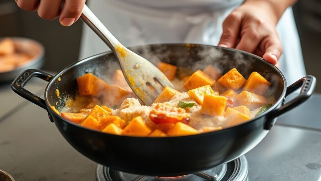 6. Adding the Core Vegetables: Introduce the cubed potatoes to the pan. Stir well to coat them evenly with the spice mixture. Cook for 3-4 minutes, allowing the potatoes to absorb some of the initial flavors.