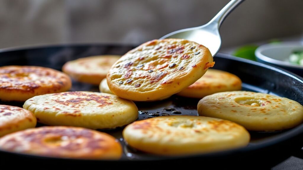 Pro-Caution: When frying arepas, always exercise extreme caution. Ensure the oil is at the correct temperature—too cool and the arepas will absorb excess oil, becoming greasy; too hot and they will cook too quickly on the outside, leaving the inside doughy. Never overcrowd the pan, as this can lower the oil temperature and lead to uneven cooking. Use a slotted spoon to carefully place and remove the arepas, and always have a plate lined with paper towels ready to drain them.