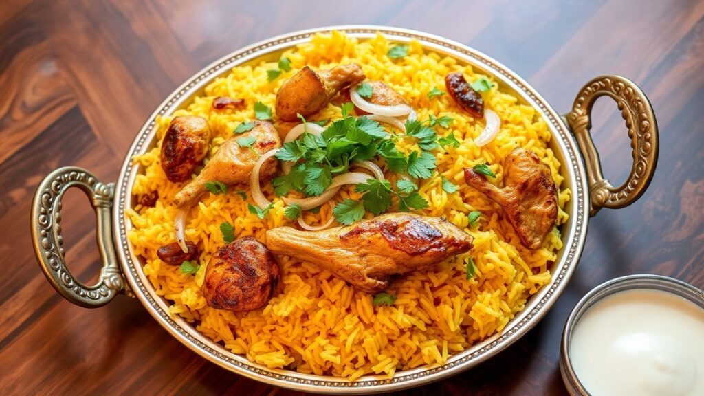 Rich Hyderabadi chicken biryani, a fragrant culinary masterpiece.