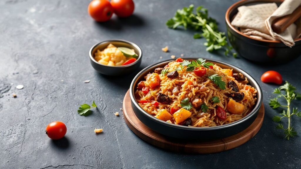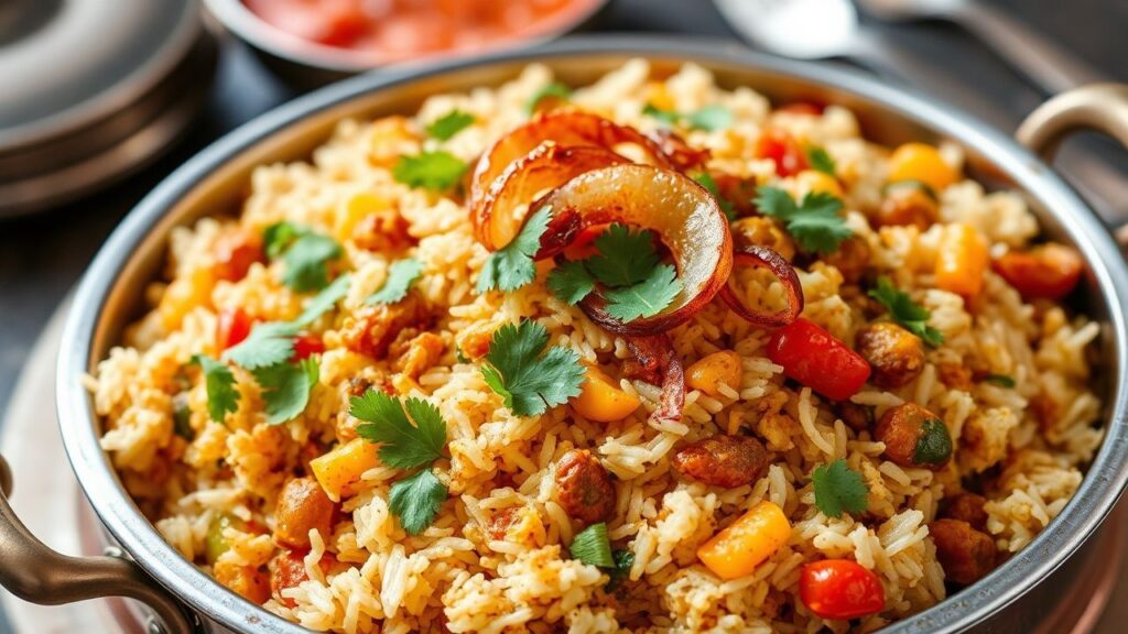 Fragrant Indian vegetable biryani, a symphony of spices and textures.