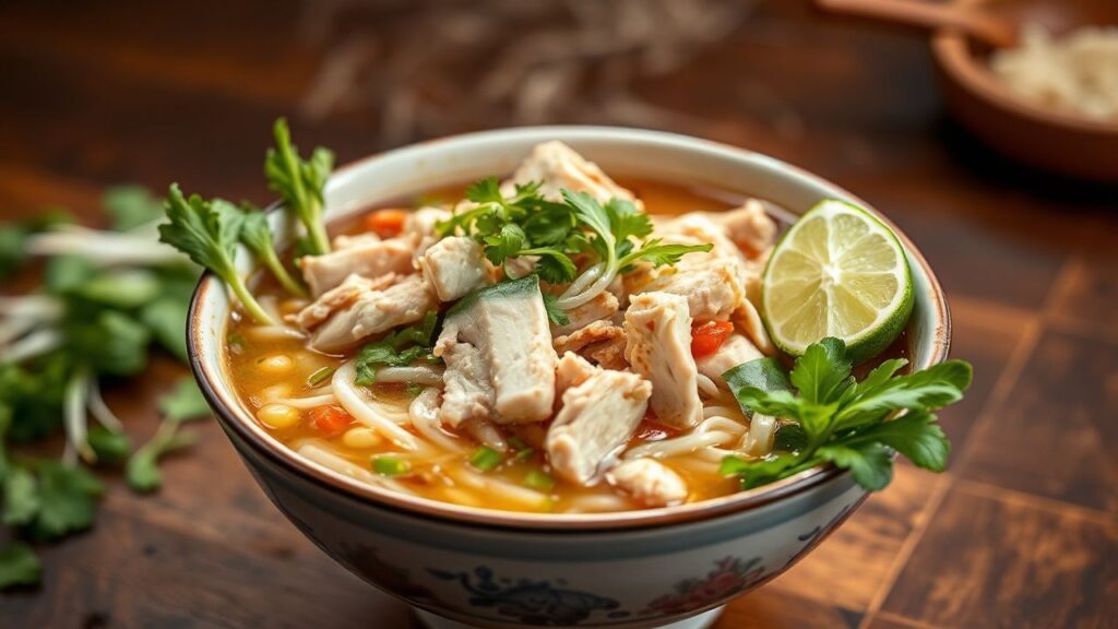 - Serve: Ladle the hot, fragrant broth over the noodles and chicken. Serve immediately with a generous platter of fresh garnishes: bean sprouts, cilantro, mint, Thai basil, lime wedges, and sliced chili and onion, if desired. Diners can customize their bowls to their preference.