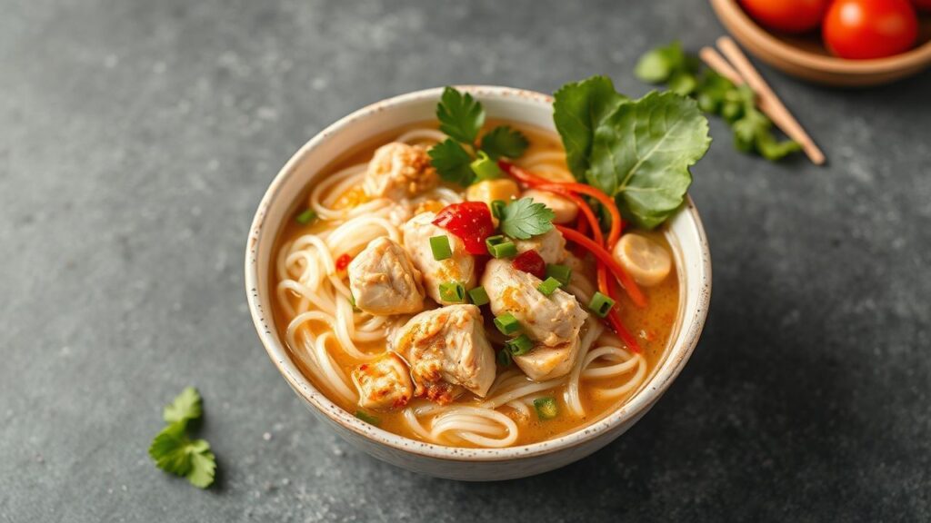 The protein content is substantial due to the chicken. Carbohydrates come primarily from the rice noodles. The fat content can be managed by skimming the broth. Sodium levels are the most variable and can be adjusted by judicious use of fish sauce and salt.