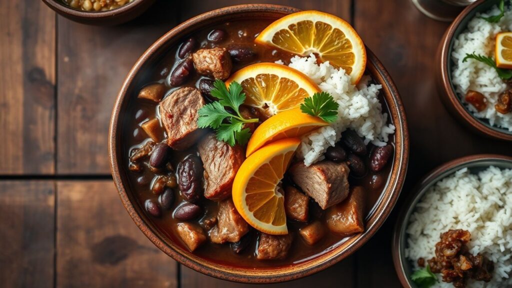 Rich, dark feijoada, a hearty Brazilian stew, simmered with soul.
