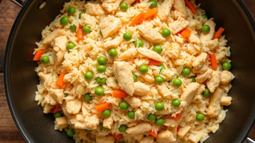 6. Add the Rice and Vegetables: Push the chicken and aromatics to one side of the wok. Add the prepared rice to the empty side. Break up any remaining clumps with your spatula and stir-fry the rice for 2-3 minutes until heated through and slightly toasted. Add the thawed peas and carrots.