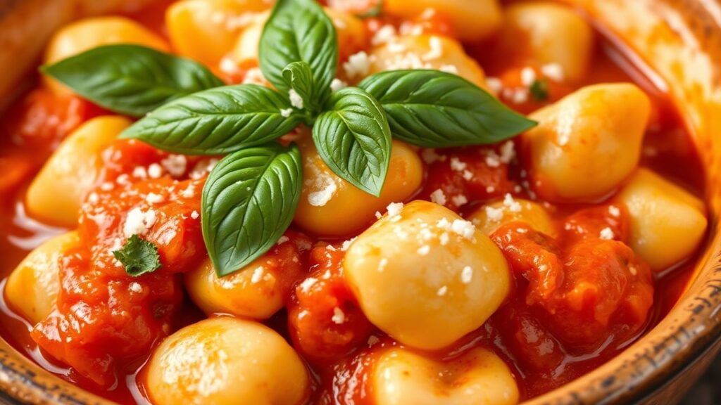 Homemade gnocchi with sun-kissed tomato sauce, a delicious culinary adventure.