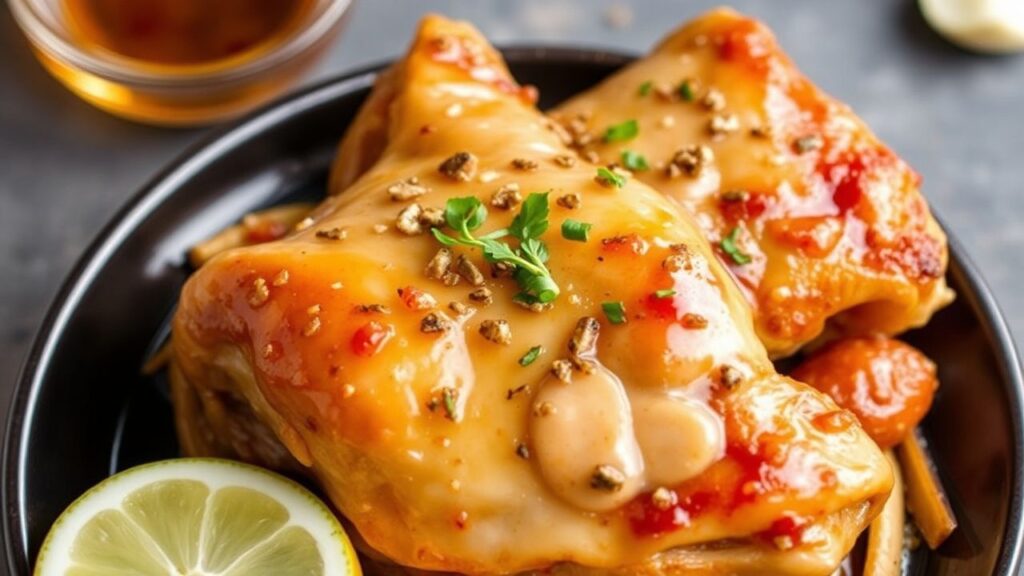 Juicy honey garlic chicken thighs, a sweet and savory delight.