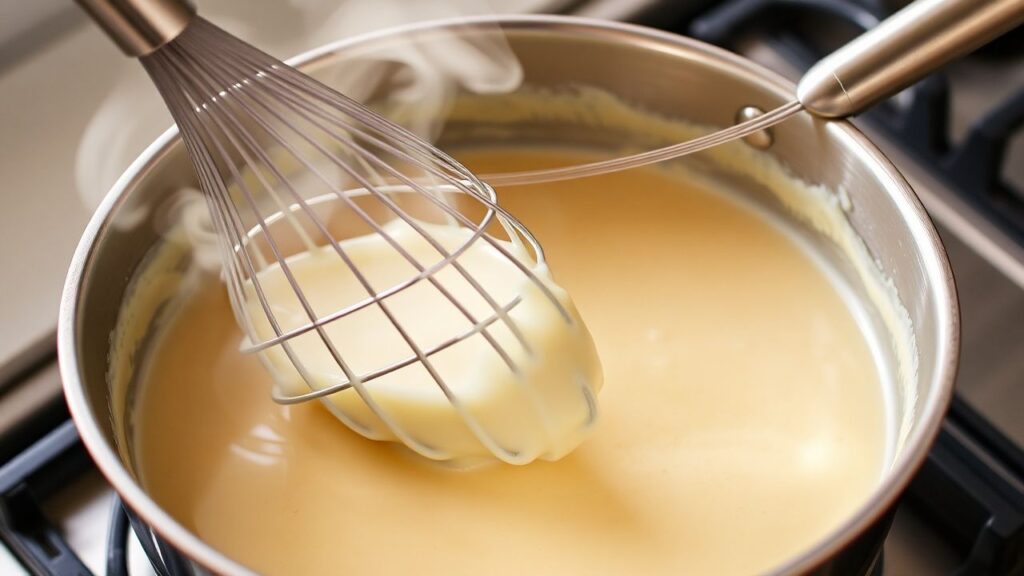6. Combine and Season: Pour the tempered egg yolk mixture back into the saucepan with the béchamel. Stir in the salt, pepper, and nutmeg (if using). Cook over low heat, stirring constantly, for another 2-3 minutes until the sauce is thick and glossy. Do not boil.