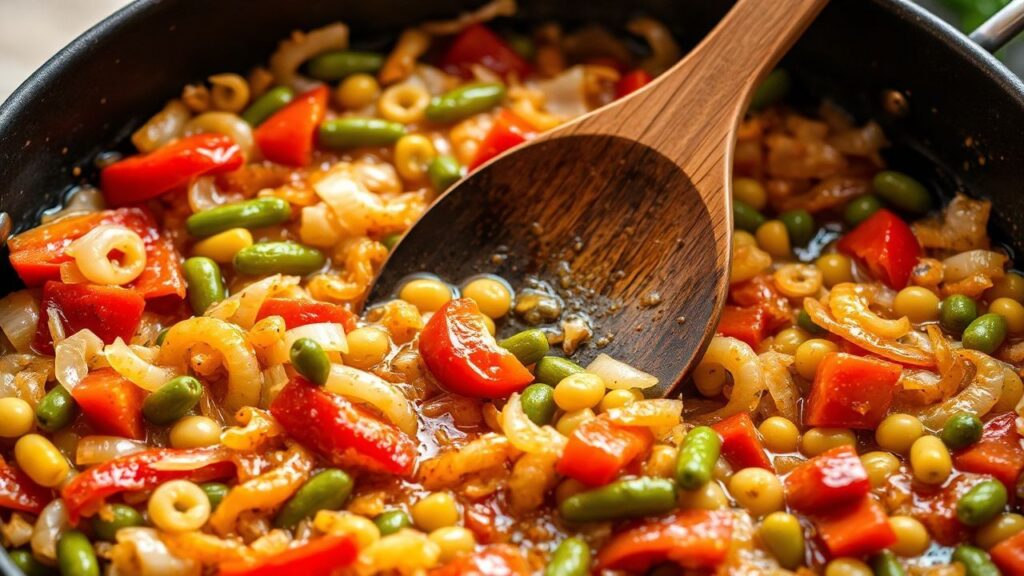 - Add the diced red bell pepper and green beans. Cook, stirring occasionally, until the vegetables begin to soften, about 5-8 minutes.