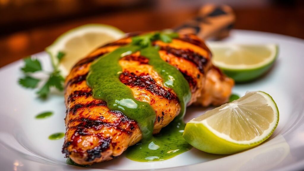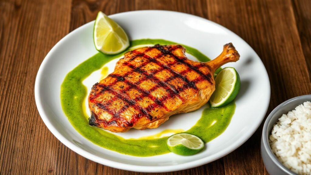 Grill or pan-sear the chicken until the skin is crisp and deeply caramelized, and the internal temperature reaches 74°C (165°F). Rest briefly to redistribute juices, then recoat lightly with the green sauce to finish. A final spoonful or drizzle of sauce on the plate completes the presentation and ensures every bite is balanced.