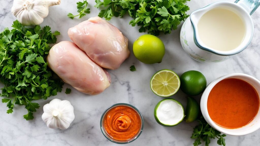 Gathering the right components is the first step toward reliable, restaurant-grade Peruvian chicken. Freshness matters, as does balance: acidity should ride the fat in the green sauce without making it oily or flat. Below is a precise list that covers the chicken, the signature green sauce, and the seasonings that unify the dish.