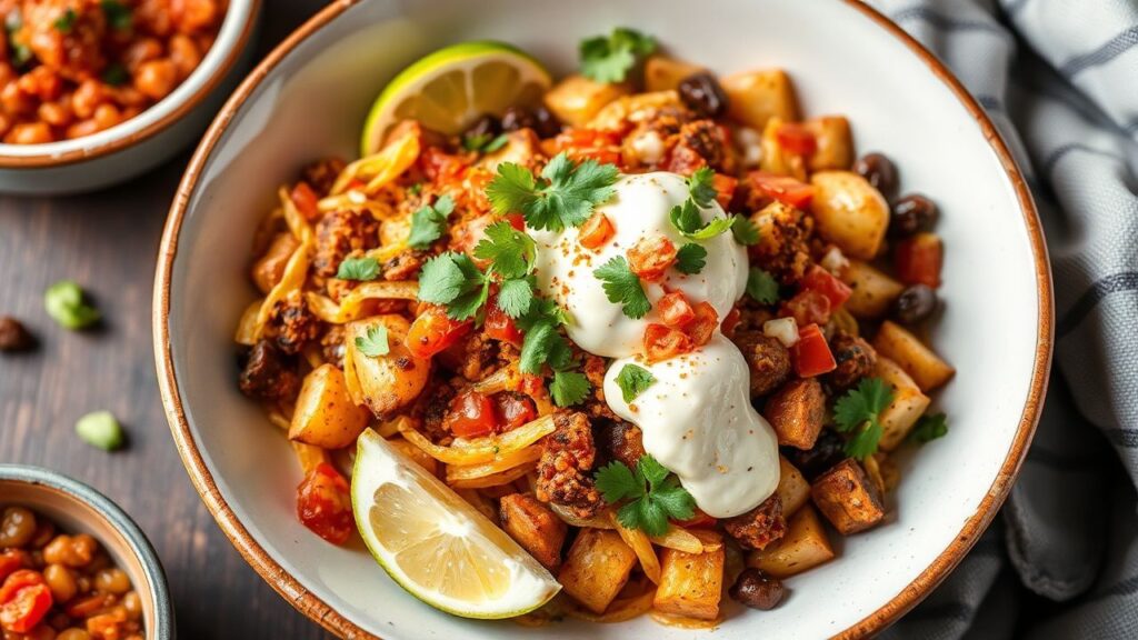 Excellent vegetarian and vegan protein alternatives for a Potato Taco Bowl include seasoned black beans, pinto beans, kidney beans, lentils, firm or extra-firm tofu (cubed and seasoned, then baked or pan-fried), and tempeh. You can also find plant-based “ground meat” crumbles that are seasoned and ready to use, mimicking the texture and flavor of traditional taco meat.