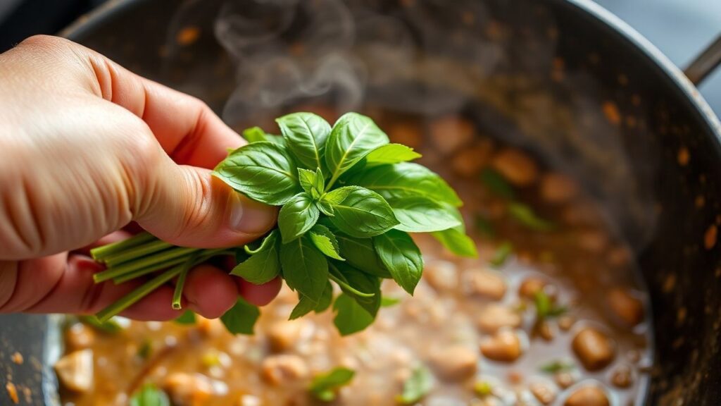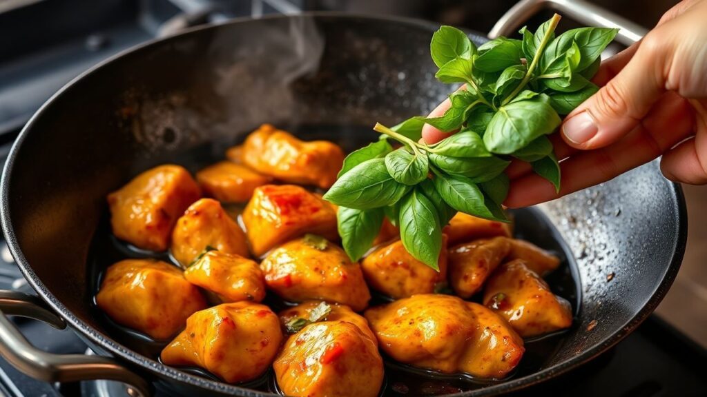 Thai basil should be added at the very last moment. Its fragrant oils are volatile and dissipate quickly with heat. A brief toss is all it needs to perfume the dish without turning mushy or losing its vibrant essence.