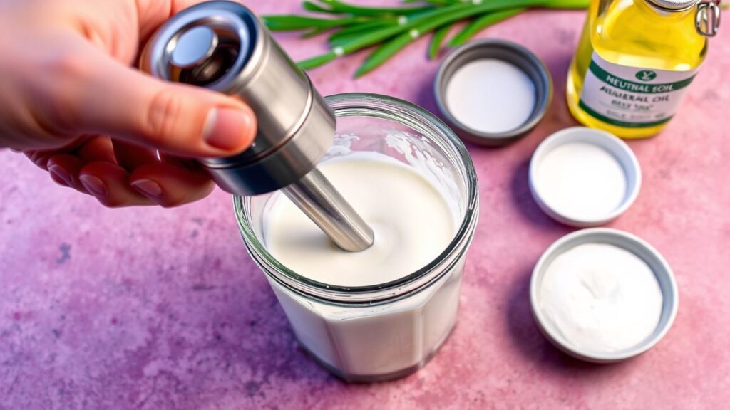 This approach leverages the immersion blender method for exceptional efficiency in creating stable emulsions. Combine your liquid base and emulsifiers in a tall, narrow container – this is essential for optimal immersion blender performance. Add the oil, but do not mix it in yet. Place the immersion blender at the very bottom of the container. Turn it on high speed and keep it at the bottom for about 15-20 seconds. You will observe a thick, creamy emulsion forming at the base. Once this occurs, slowly lift the blender upwards, incorporating the remaining oil until the entire mixture is thick and creamy. This process, when executed correctly, requires less than a minute of active blending.